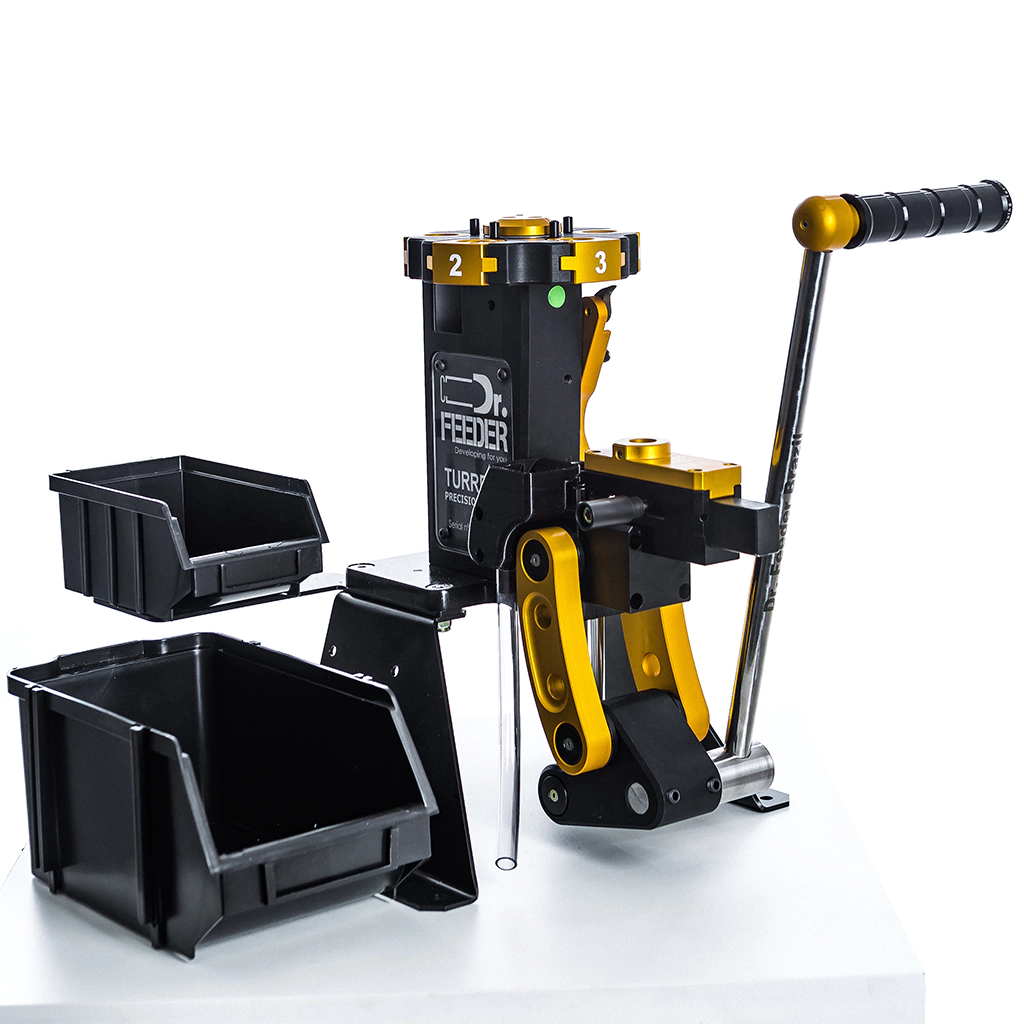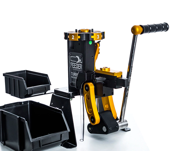 A Turret Precision Dr. Feeder é a única do mercado que possui um inovador sistema de troca de Dies e demais acessórios sem precisar desenroscar os mesmos e perder as suas regulagens. O sistema de Mini Toolheads, que é um produto criado e patenteado pela Dr. Feeder, possui os Mini Toolheads numerados, facilitando a identificação dos estágios e sua rápida montagem.